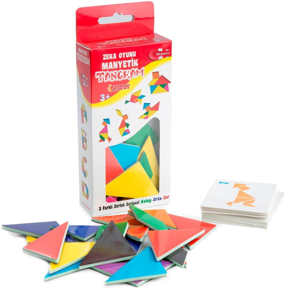 Tangram parçalarındaki manyetik taban sayesinde buzdolabı gibi metal yüzeylere yapıştırabilirsiniz.