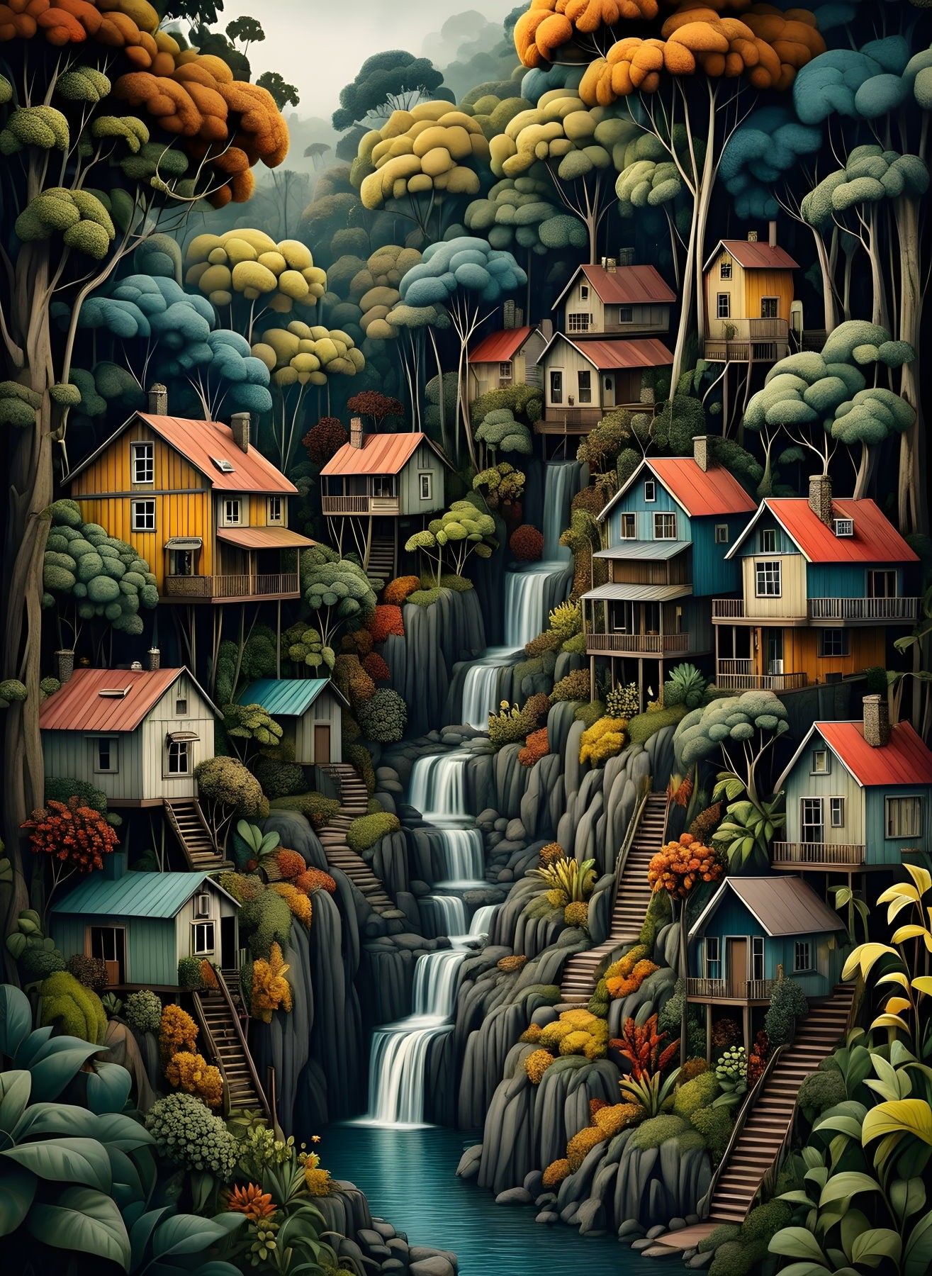 Görselde, yemyeşil devasa ağaçların arasında, uçsuz bucaksız bir uçurumun iki yakasına kurulu rengarenk ahşap evler dikkat çekiyor. Turuncu, sarı, mavi, kırmızı ve pastel tonlardaki çatılar, adeta bir gökkuşağı gibi ormana serpilmiş gibi duruyor. Evlerin çoğu yüksek ahşap kazıklar üzerine ya da ağaçların dallarına asılı şekilde inşa edilmiş; bazıları ise uçurumun kenarına cesurca tutunmuş.
