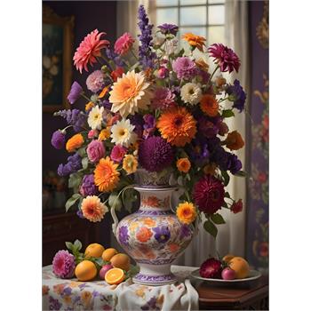 Görselde, zarif işlemeli büyük bir seramik vazonun içinde muhteşem bir çiçek aranjmanı yer alıyor. Vazodaki çiçekler adeta bir renk şöleni oluşturuyor: canlı turuncu, derin mor, yumuşak pembe, krem, sarı ve lavanta tonlarında gerberalar, krizantemler, lavantalar, güller ve çeşitli dolgu çiçekleri bir arada kullanılmış. Çiçekler özenle düzenlenmiş, bazıları yukarı doğru uzanırken bazıları zarifçe sarkıyor; bu da puzzlea hem hareket hem de derinlik katıyor.