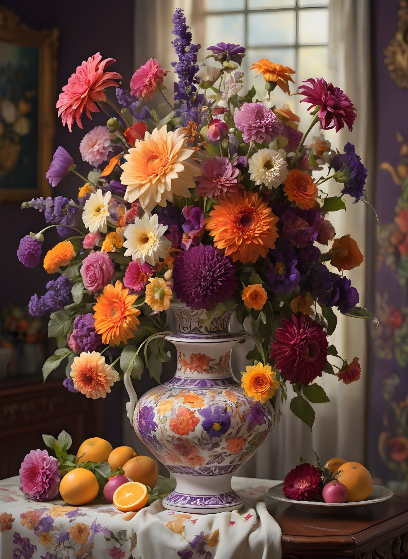 Arka plan yumuşak gün ışığı alan bir pencere ve mor tonlarda zarif bir duvar kağıdıyla tamamlanıyor. Işık, çiçeklerin renklerini daha da parlatırken ortama sıcak ve davetkar bir hava katıyor.