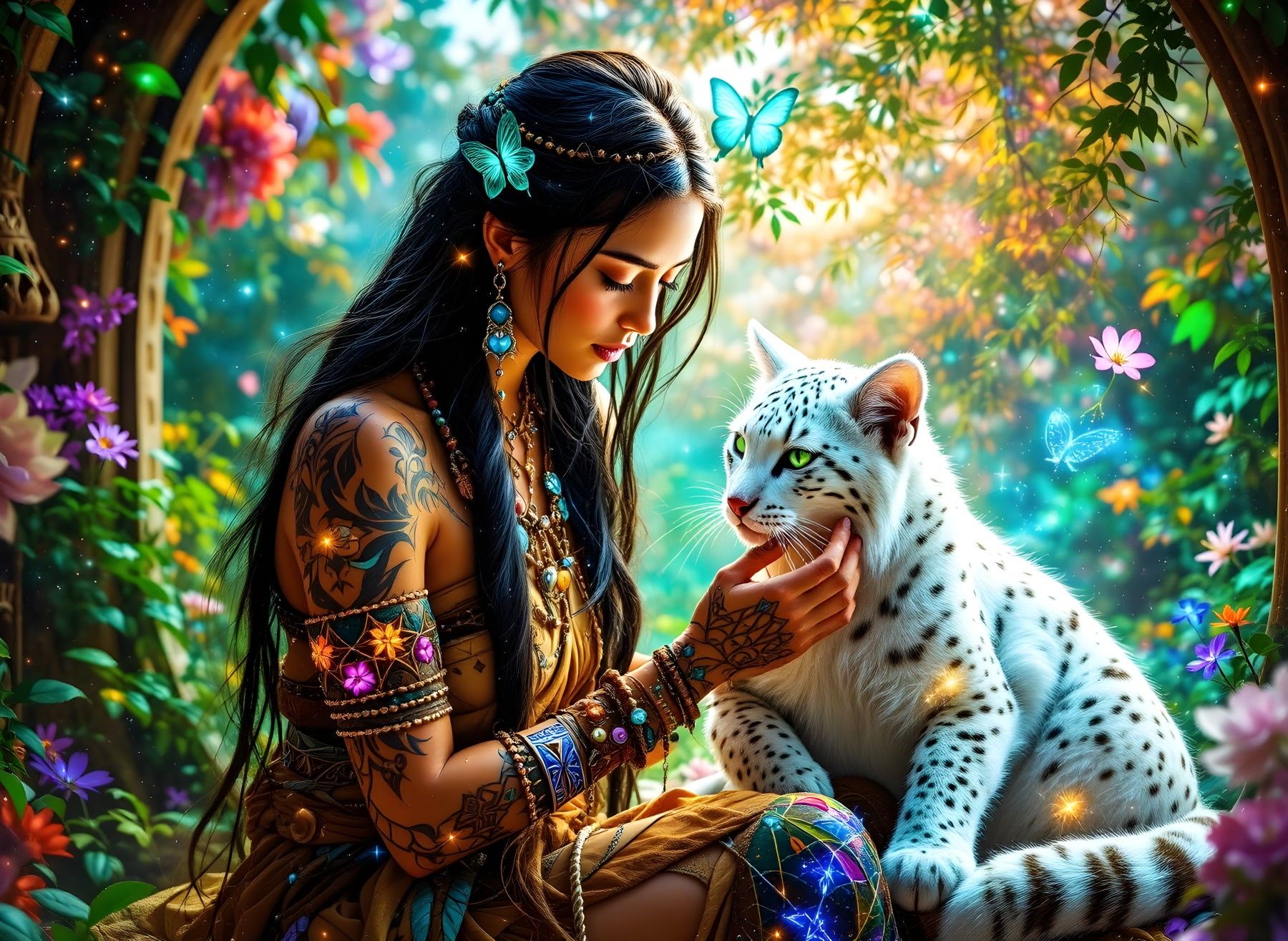 Bir masal bahçesinin derinliklerinde, gizemli ve güçlü bir kadın figürü, göz kamaştırıcı beyaz bir kar leoparını sevgiyle okşuyor. Kadının uzun, gece mavisi saçları kelebek tokalarla süslenmiş, kolları ve omuzları doğa temalı dövmelerle kaplı. Boynunda ve bileklerinde turkuaz taşlı, mistik takılar parlıyor. Kar leoparının ise zümrüt yeşili gözleri ve karbeyaz tüyleri adeta ışık saçıyor.