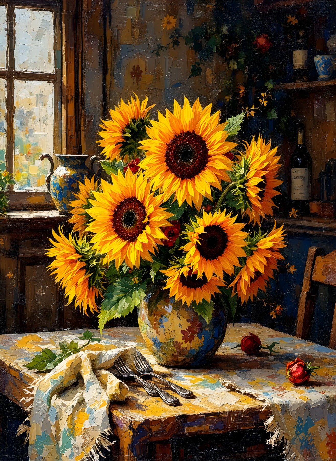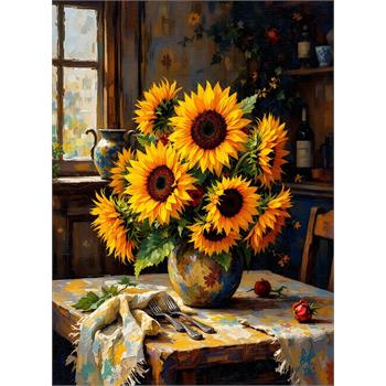 Bu büyüleyici görsel, sıcacık bir köy evinin iç mekanında, masanın üstünde capcanlı ayçiçekleriyle dolu bir vazoyu konu alıyor. Parlak sarı ve turuncunun hakim olduğu ayçiçekleri, adeta güneşi içeri taşımış gibi; her bir çiçek, yapraklarına kadar detaylı ve canlı işlenmiş.