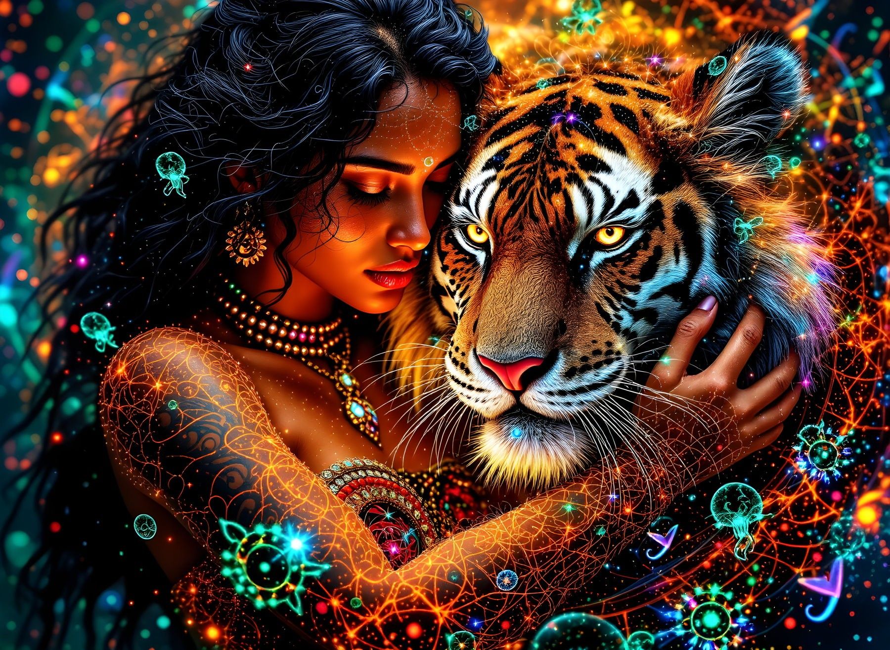 Etrafını saran renk cümbüşü ise adeta bir rüya aleminden fırlamış: turuncu, kırmızı, mor, turkuaz ve altın tonlarında ışık patlamaları, parıldayan enerji dalgaları, mistik semboller... Kadının kollarındaki ve göğsündeki ışıkla işlenmiş gibi görünen dövmeler, boynundaki boncuklu kolyeler ve kaplanın tüylerindeki yıldız tozu etkisi, görseli tam bir sanat eserine dönüştürüyor.