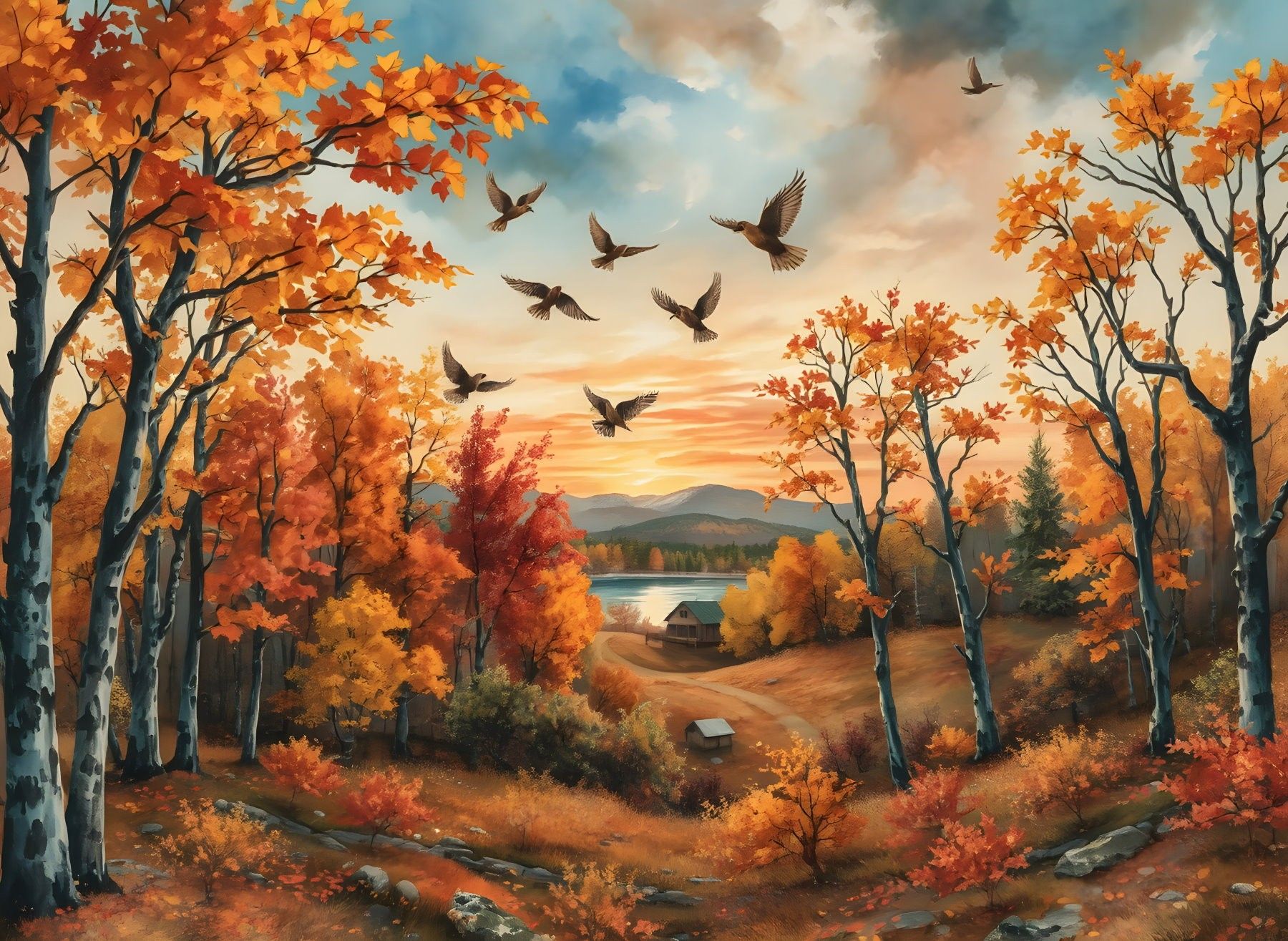 - Tema : Sonbahar, Kuşlar, Dağ Evi, Mevsimler