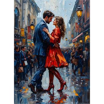 Yağmur hafifçe çiselerken yerdeki su birikintileri, sokak lambalarının ve vitrin ışıklarının yansımalarıyla adeta bir ayna gibi parlıyor. Arka planda bulanık ama hareketli bir kalabalık var; herkes mavi ve gri tonlarında, şemsiyeli ya da pardösülü insanlar aceleyle yürürken, çift tamamen kendi dünyasında, kalabalığın ortasında yavaşça dans ediyor.